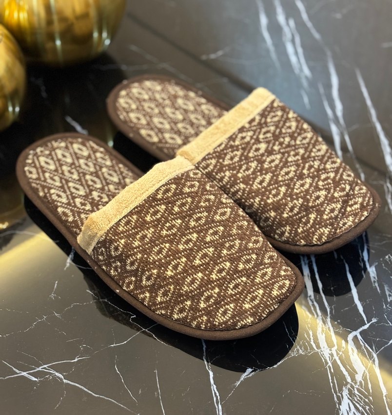 Örgü detaylı, kahverengi kadın terlik. Koyu yılan desenli, rahat ve dolgu topuklu, günlük kullanım için uygun.