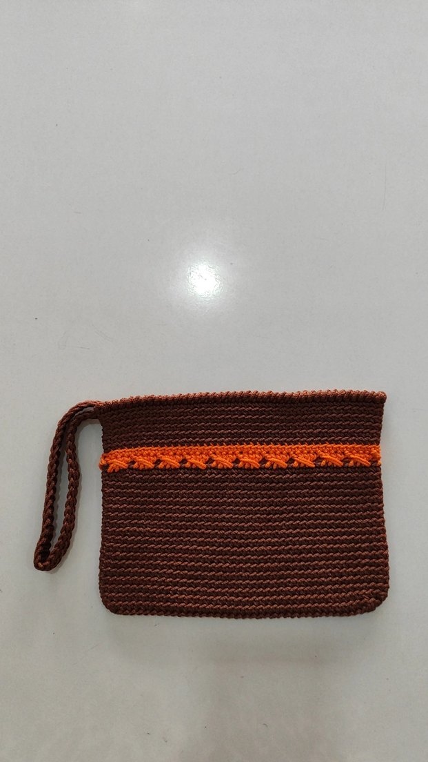Kahverengi örgü kadın clutch çanta, turuncu şerit detaylı sade tasarım. Rahat bohem tarzıyla günlük kullanıma uygundur.