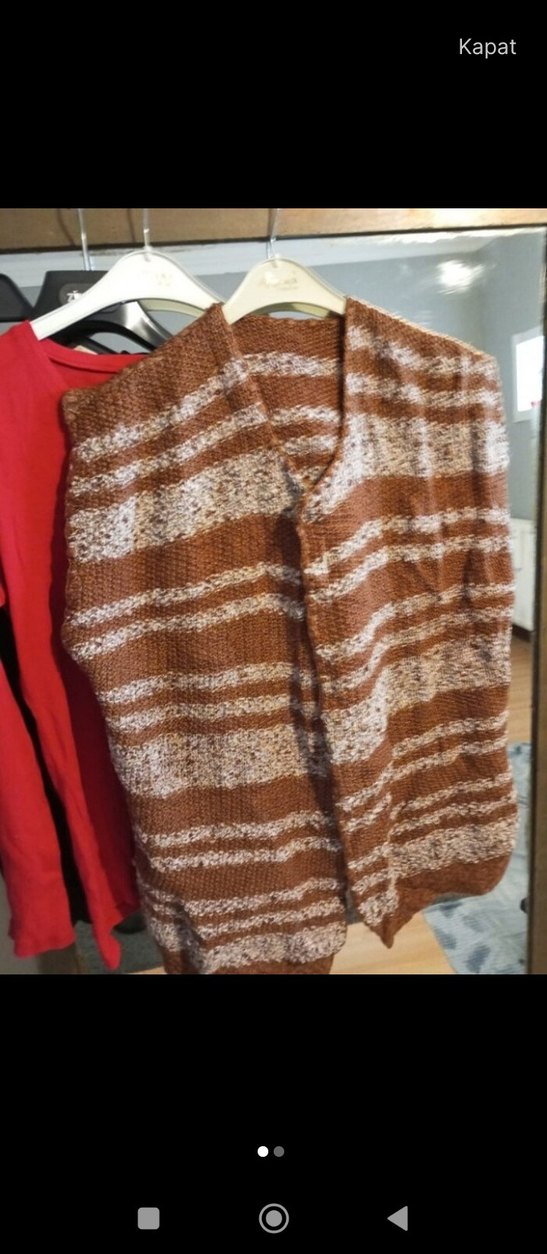Örgü kahverengi, kolsuz, salaş kesim hamile süveter. Kayık yaka ve rahat çizgili deseniyle midi boyda, bohem tarzda, günlük kullanıma uygun.