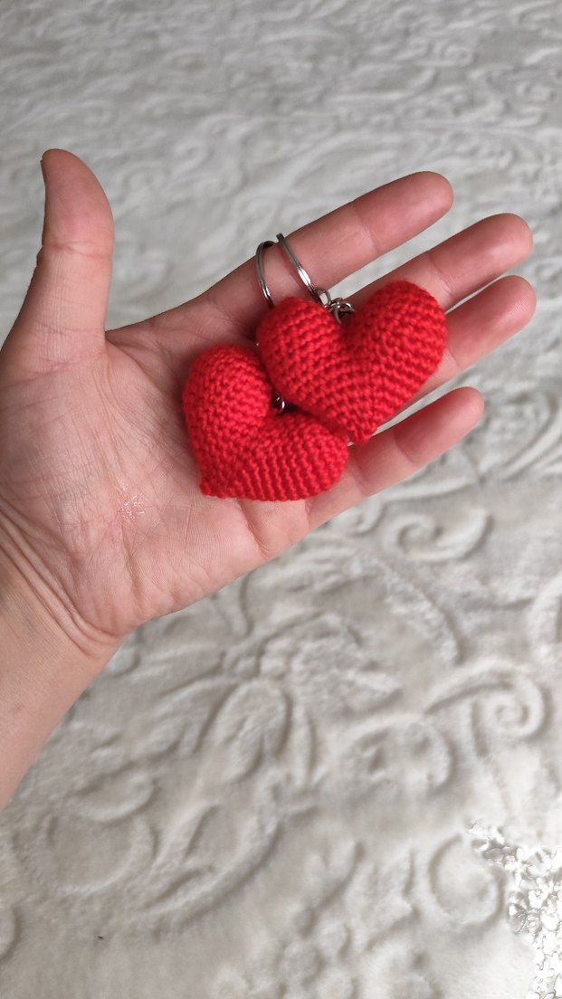 kırmızı renkli, örgü kalp şeklinde anahtarlıklar. Rahat ve cesur sokak stili aksesuarı olarak kullanılabilir. ❤️