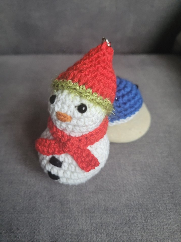 Bu renkli peluş oyuncak, kırmızı şapka ve atkı ile örülmüş kar adam figürüne sahiptir. Anahtarlık veya çanta süsü olarak kullanılabilir.