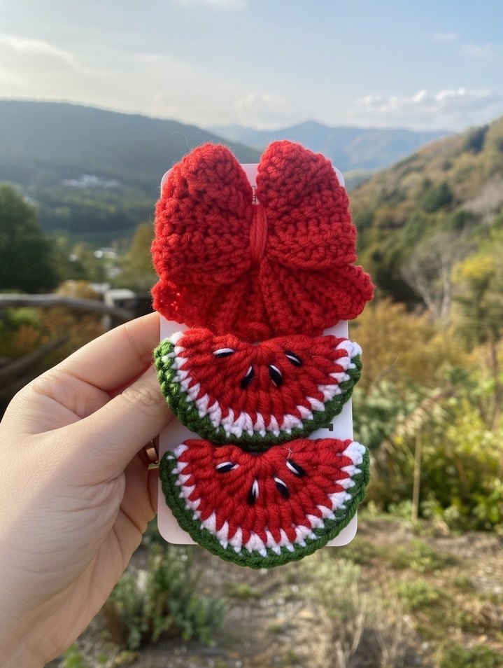 Renkli nakışlı örgü çocuk saç tokaları, karpuz ve fiyonk desenleriyle bohem tarzda.