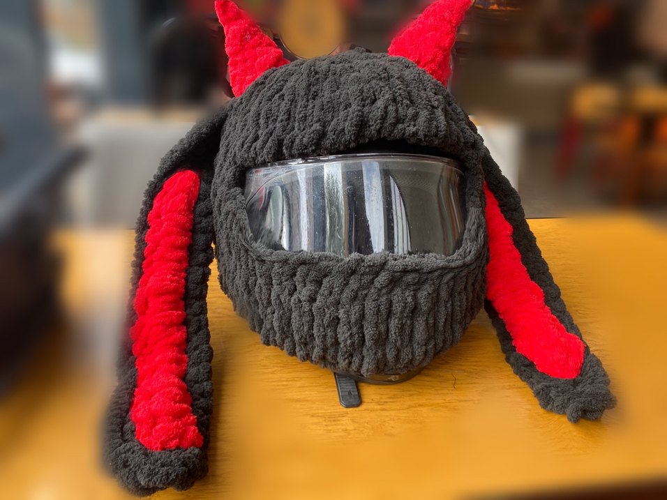 Örgü Kask Kılıfı Kırmızı Siyah Şeytan Boynuzlu