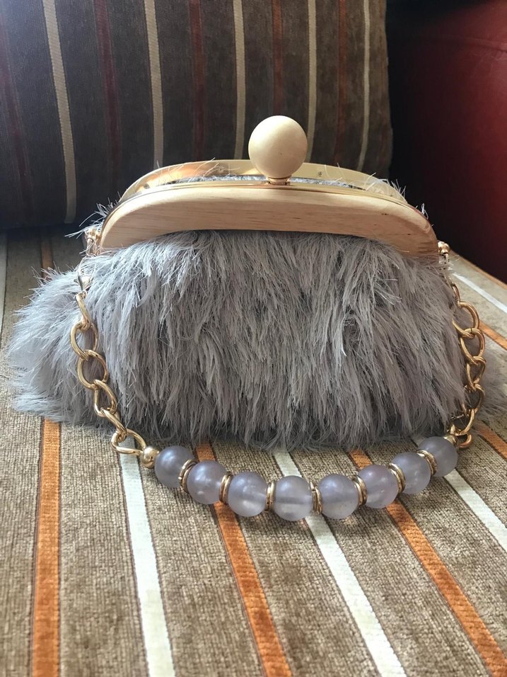 Gri Kaz Tüyü Kürklü örgü Bohem ahşap kapaklı kadın çantasıdır. Boncuklu zincir sapı ile bohem tarzını yansıtır. Günlük kullanıma uygundur.