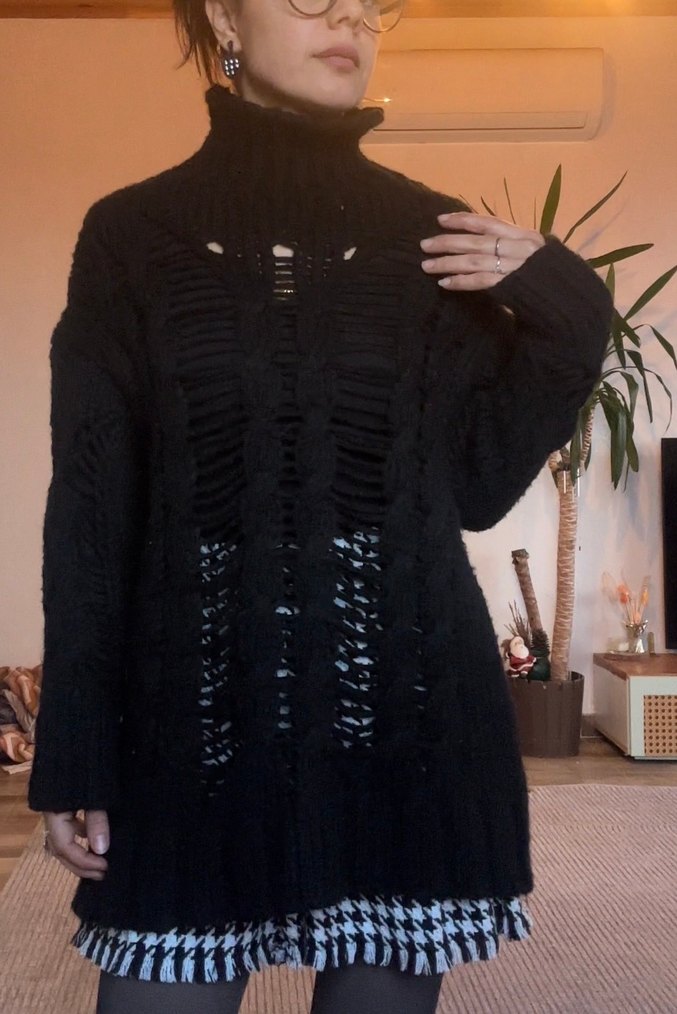 Siyah örgü kazak, yüksek yakalı ve uzun kollu, bol kesim. Gotik tarzda desenli, midi boy, etek, şort, tayt üzerine çok güzel uyumlu içine uzun kol yada askılı giyip kombin yapabilirsiniz.