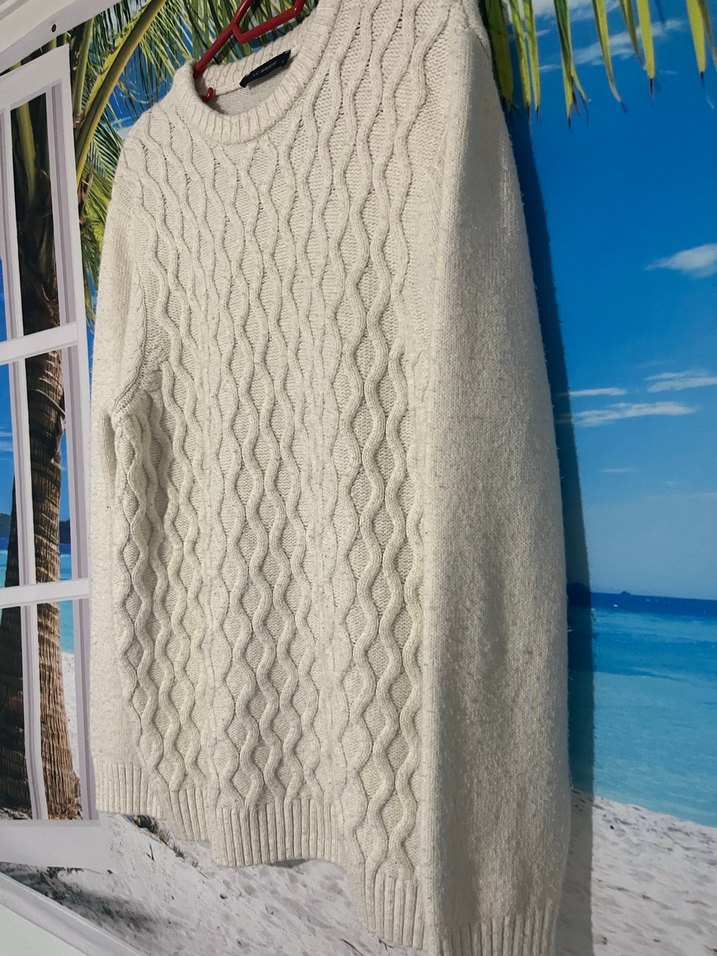 Beyaz örgü kumaştan, yuvarlak yakalı ve uzun kollu, bol kesim erkek kazak. Günlük kullanım için rahat ve bohem tarzda bir parça.
