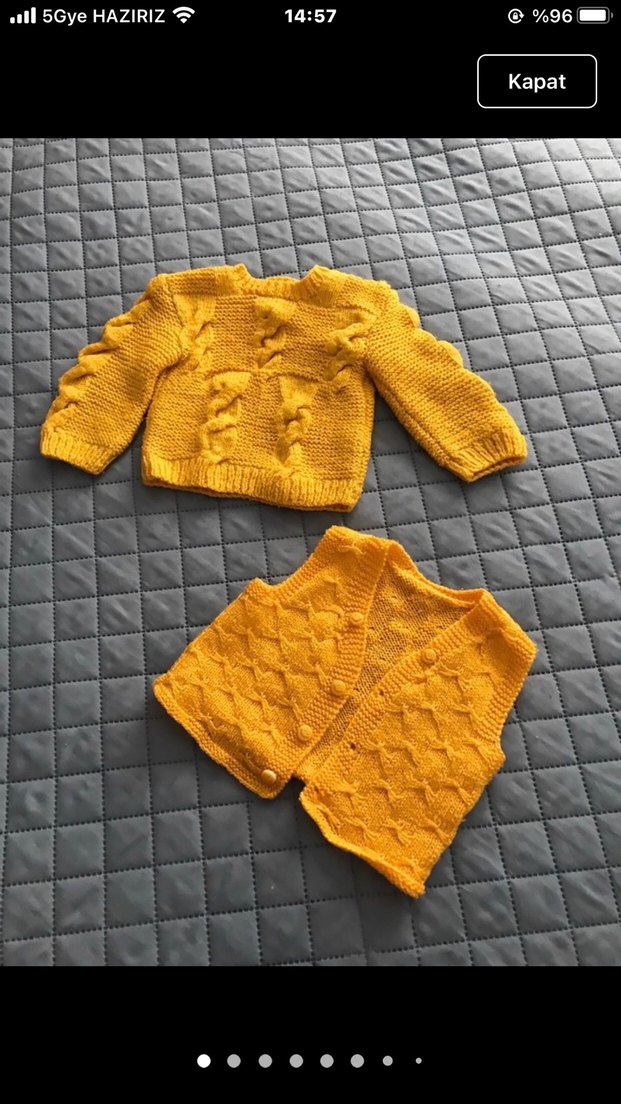 Sarı renkli, uzun kollu ve bol kesim örgü hırka ile dokulu desenli, kolsuz yelek takımı. el örgüsü 0/1 yaş