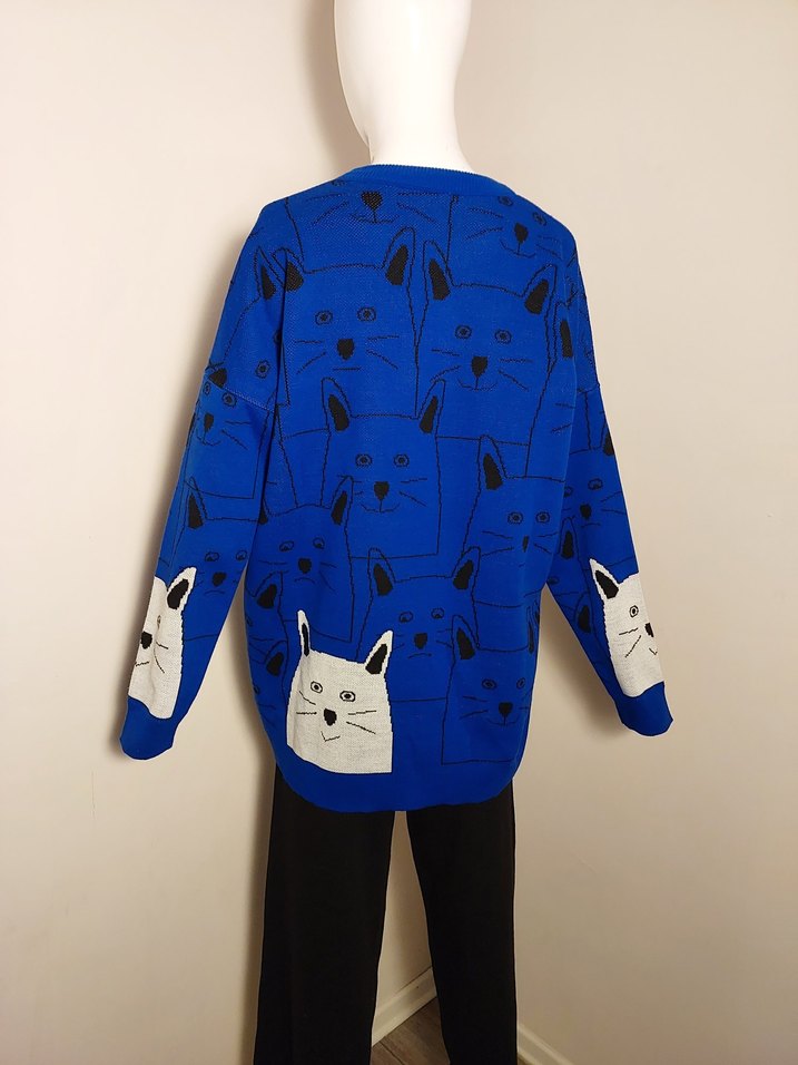 Bu koyu mavi örgü streetwear kazak, eğlenceli kedi desenleri ile günlük kıyafetlere hareket katıyor.