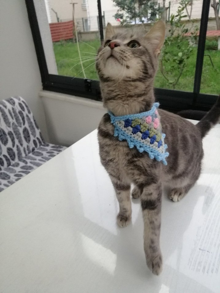 Pastel gri renkli, mavi ve pembe detaylı örgü kedi boyun bandı, evcil hayvanınıza şık bir dokunuş katar.