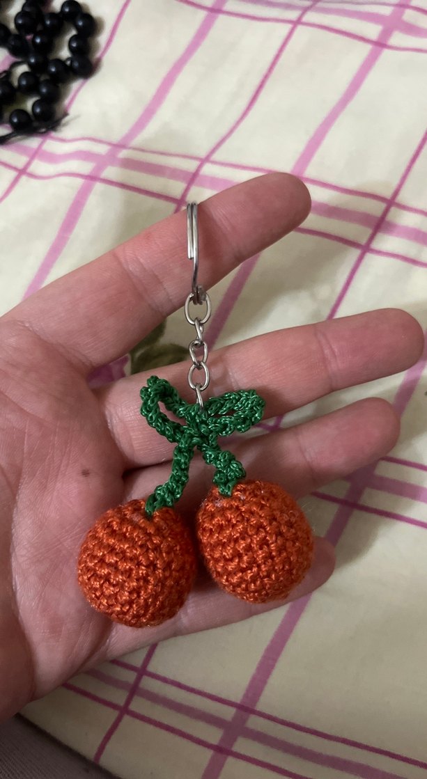 Örgü iki turuncu kiraz ve yeşil saplı anahtarlık, bohem tarz için renkli ve rahat bir aksesuar.