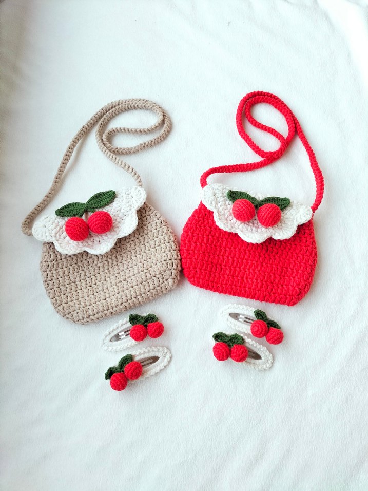 Örgü Kirazlı Çocuk Çantası &Toka Seti