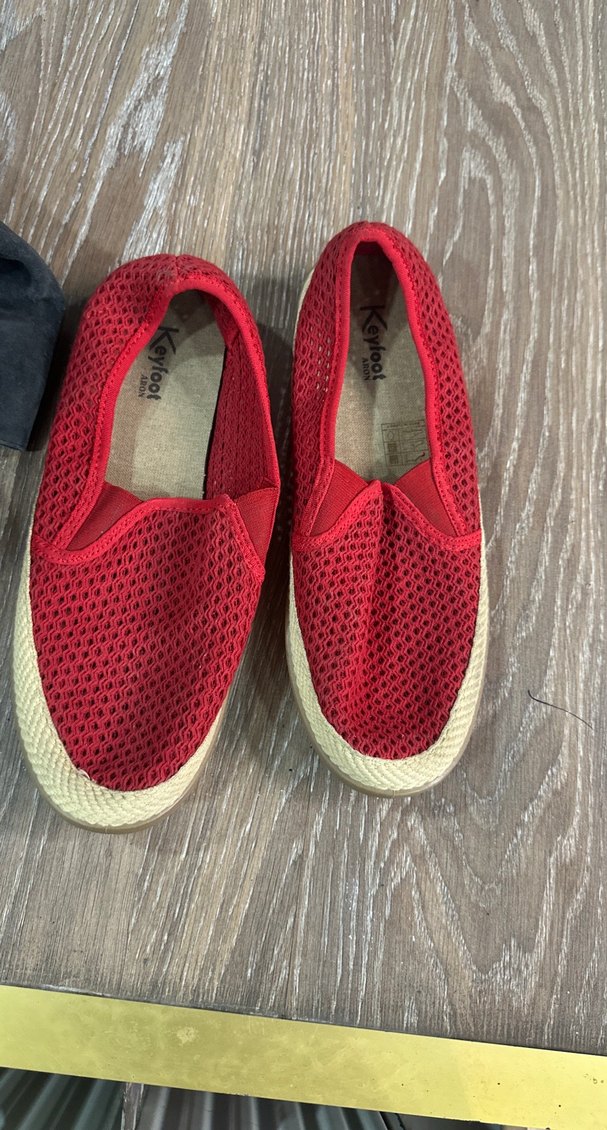 Kırmızı örgü üst ve kauçuk tabanlı erkek espadril. Sokak stili ve dış mekan kullanımı için hafif, renkli ve rahat bir ayakkabı.