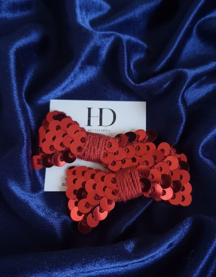 Nakışlı pullarla süslenmiş kırmızı bohem tarzı saç tokaları, fiyonk detaylıdır ve şık bir görünüm sağlar. 5cm çıt çıt toka uzerine tuylenmeyen ip ve boncuklarla örülmüştür. Elimde bu renk sadece 2 adet var. Çift fiyatıdır.
