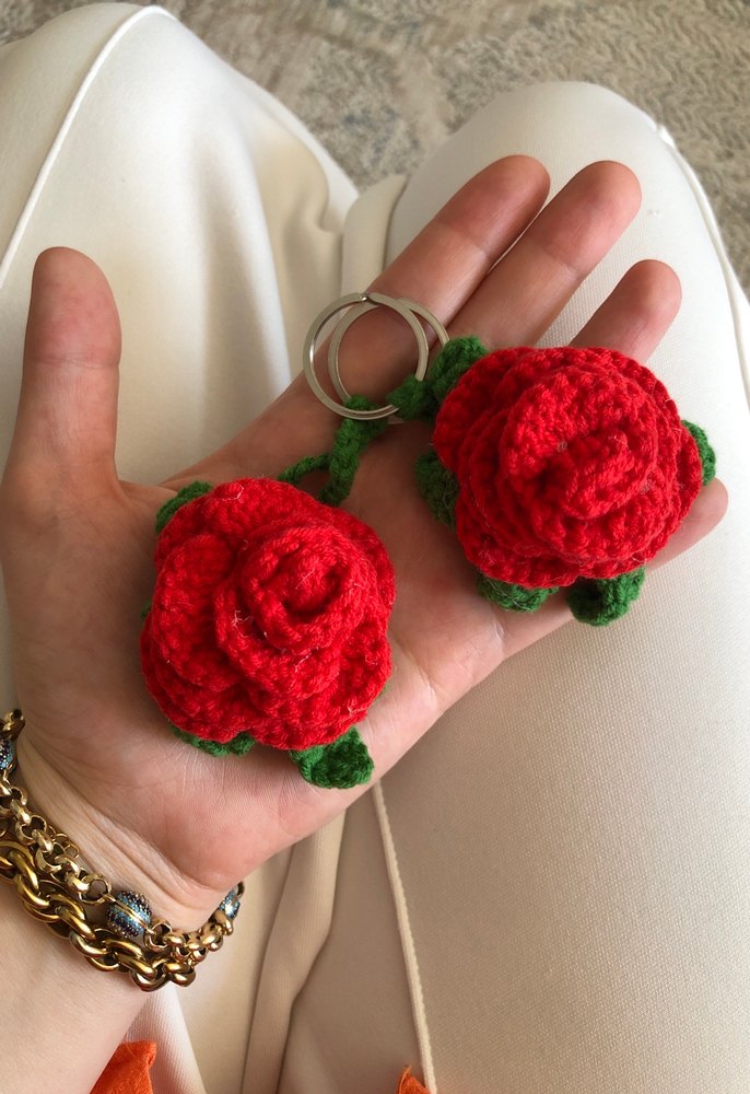 Örgü kırmızı gül şeklinde anahtarlık, yeşil yaprak detaylıdır. Rahat ve bohem tarzı yansıtır, anahtarlarınıza renk katar.