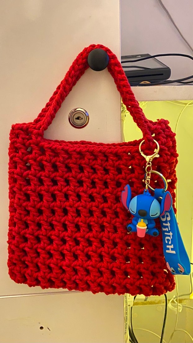 Renkli kırmızı kadın çanta, örgü tasarıma ve rahat bohem stile sahiptir. Sevimli Stitch anahtarlık ile tamamlanmıştır.