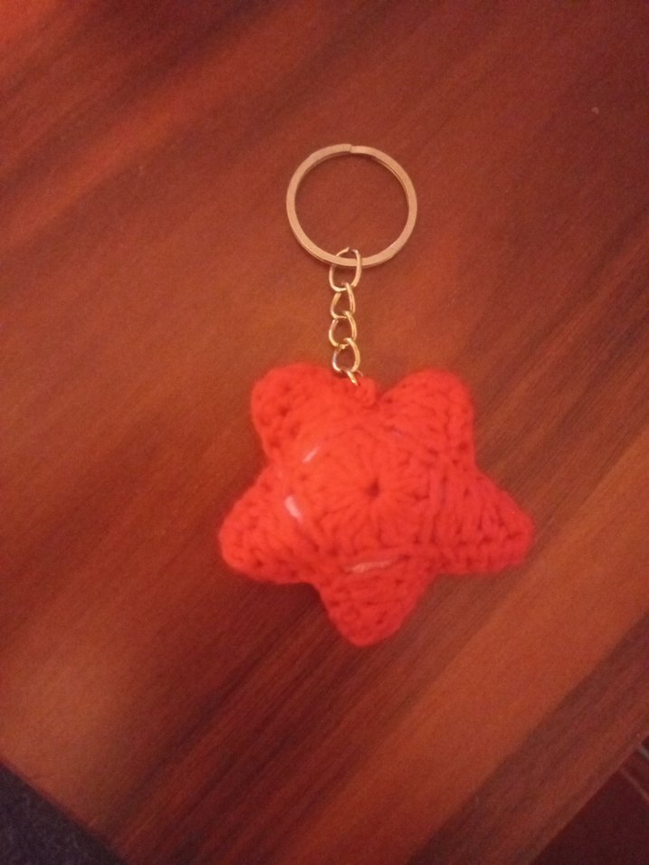 Renkli, örgü kırmızı yıldız şeklinde anahtarlık. Rahat ve bohem tarzda, retro ve hippie dokunuş katıyor. satılmak için örülmüştür.