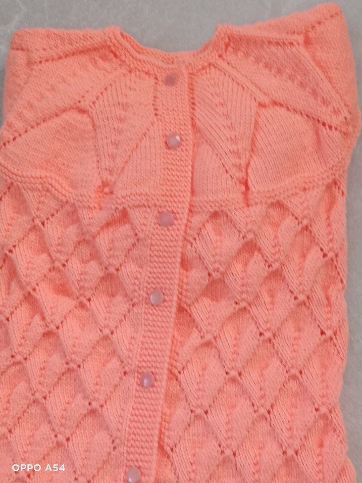 El örgüsü kız çocuğu için hırka, Anti-pilling ip ile örülmüştür.Sıfır ürün en 34cm, boy 47cmdir.Renk somon
