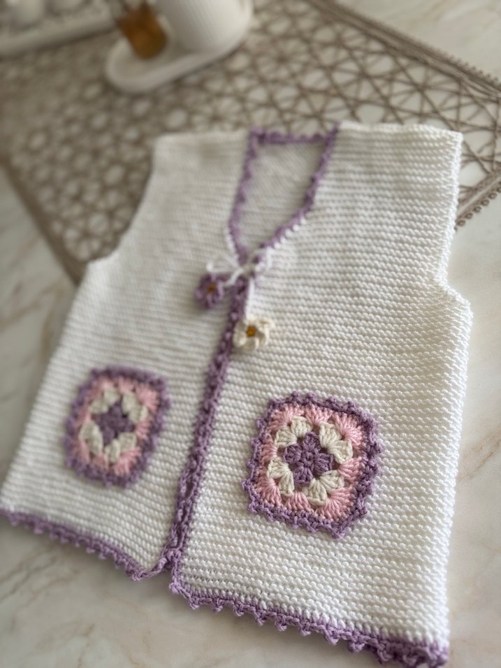 Kızlar için nakışlı, örgü yakalı kolsuz yelek.