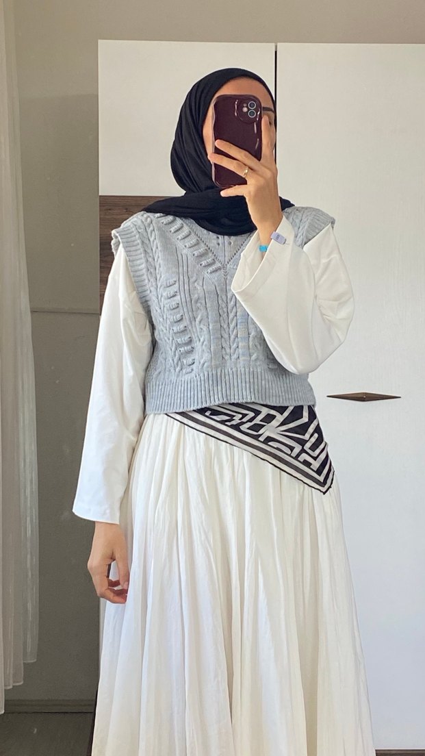 kadın süveter, örgü dokulu, gri tonlarda hafif batik desenlidir. Bohem tarzda, sade ve günlük kullanıma uygun.