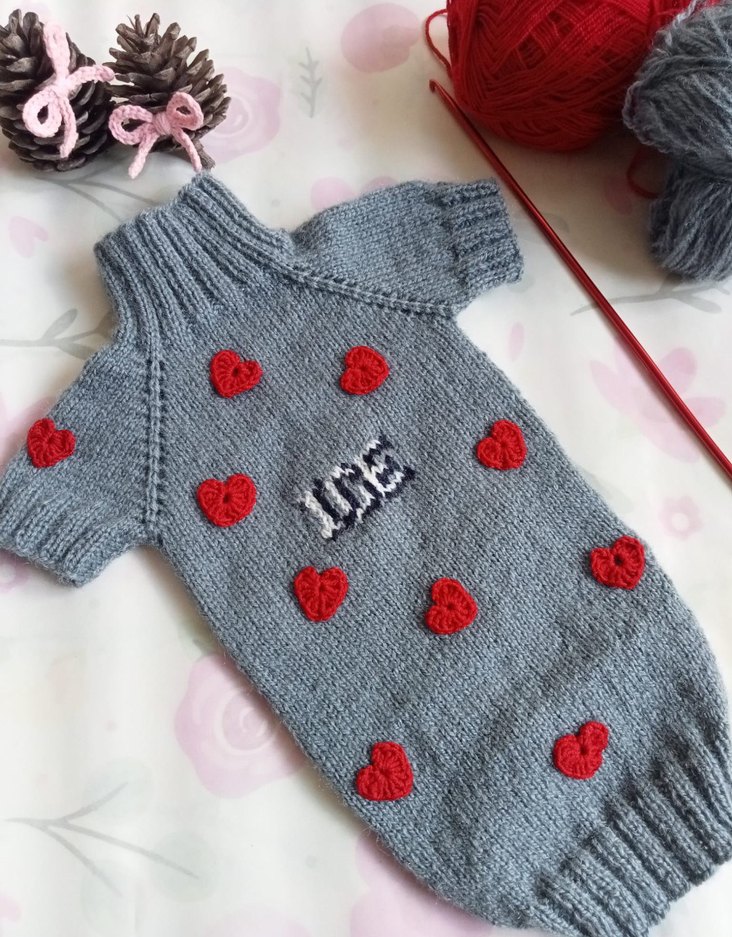 Nakışlı kırmızı kalpler ve 'LOVE' yazısı ile süslenmiş gri örgü köpek kazağı, sokak stili için uygun. istenilen renk örülür ve isim özel olarak yazılabilir.