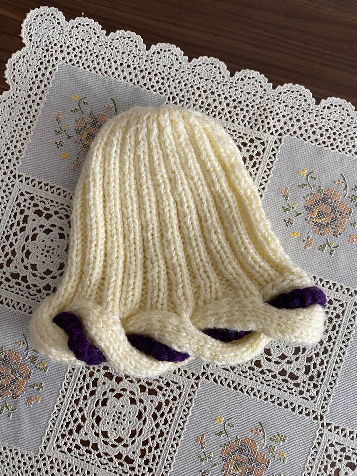 Yumuşak dokulu, beyaz örgü kadın bere, kıvrımlı kenar detaylarıyla bohem ve retro tarzı yansıtıyor. Rahat ve şık bir görünüm sunar.