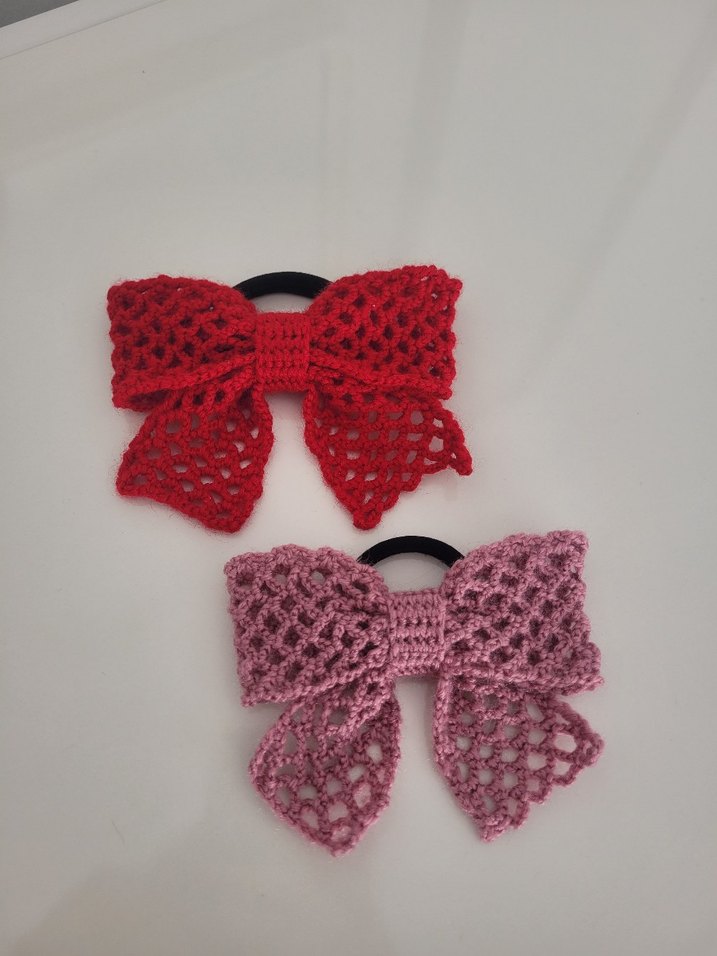 Pembe renkli, örgü fiyonk detaylı saç lastikleri. Vintage ve renkli gotik tarzıyla dikkat çeker.