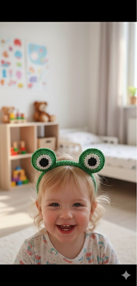 Örgü yeşil saç bandı, renkli ve eğlenceli kurbağa gözleriyle çocuklar için uygun. Cotton ip ile örülmüştür. Çocukların zevkle takabileceği bir taç modelidir.Özenle ve zevkle yaptığım bir modeldir.