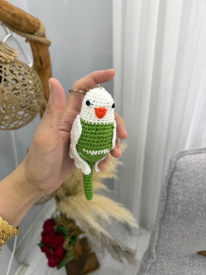 Yeşil ve beyaz örgü kuş figürlü renkli anahtarlık, anahtarlarınıza bohem ve rahat bir hava katar.