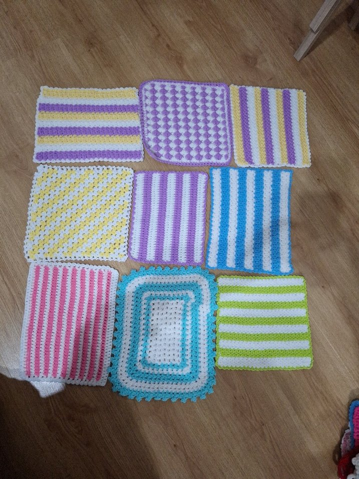 Pastel renklerde, çeşitli desen ve çizgilerle yumuşak banyo süngerleri seti.