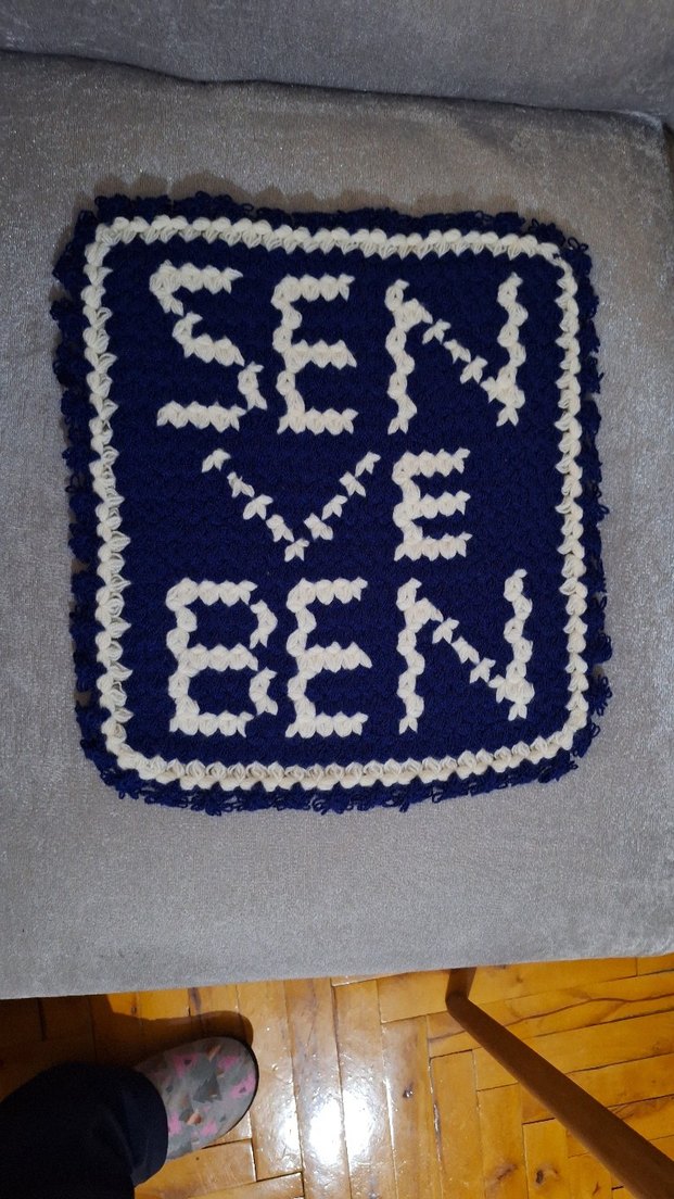 'SEN VE BEN' yazılı lacivert ve beyaz renkli dokulu banyo lifi yumuşak ve emici yapıda.