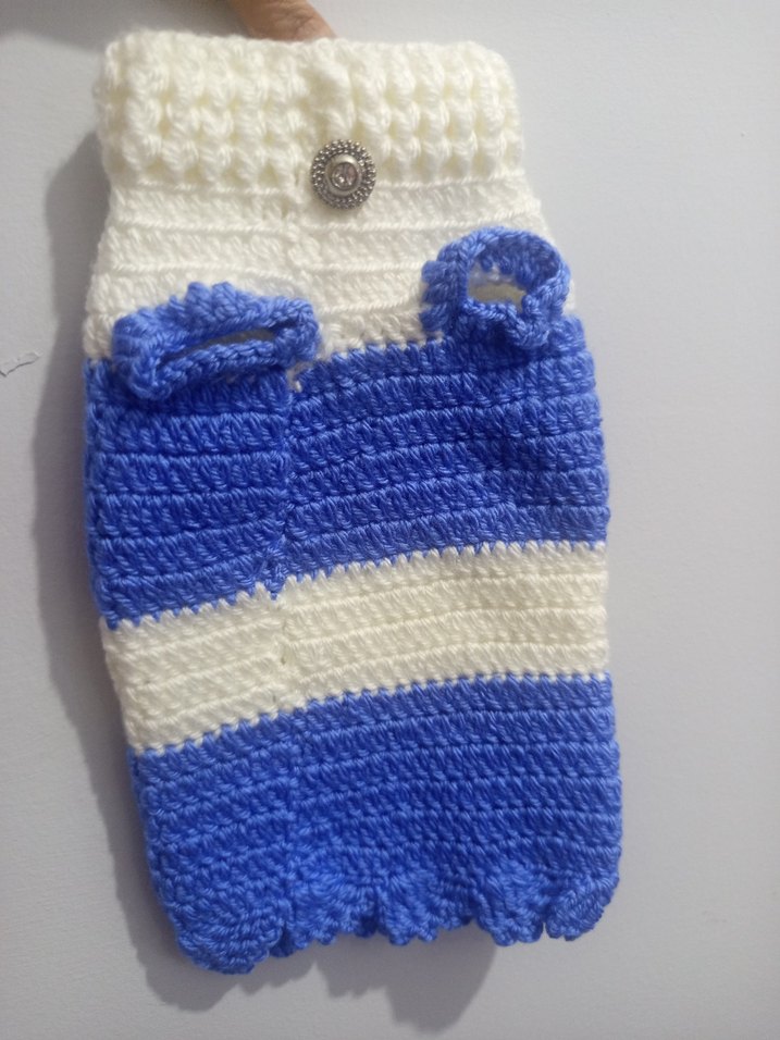 Mavi ve beyaz renklerde, düğme detaylı, örgü ve desensiz köpek kazağıdır.