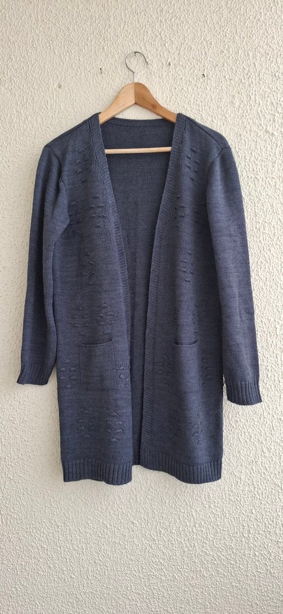Lacivert renkte, örülmüş, cepli, notched lapel yakalı, bol kesim ve midi uzunlukta kadın hırka. Rahat ve günlük kullanıma uygun. Uzunluğu 83, iki koltuk altı ölçüsü 52.