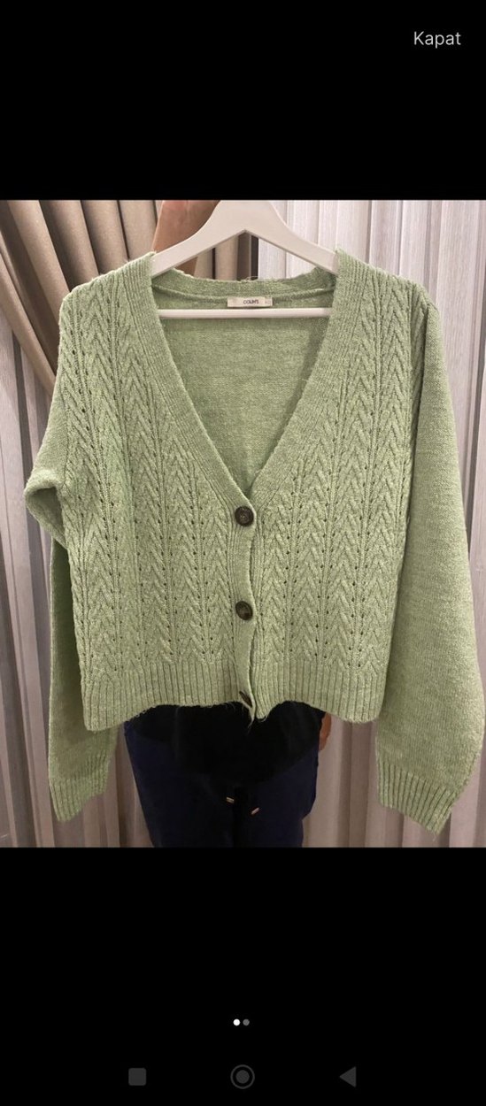 Pastel yeşil renkli, gevşek kesim, V yaka ve uzun kollu örgü hırka. Midi boyda, bohem tarzda ve rahat kullanıma uygun.