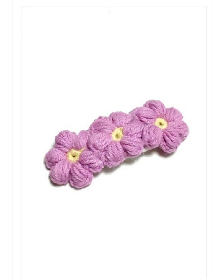 Örgü mor renkli, çiçek desenli çocuk saç tokası, bohem tarzını yansıtır.