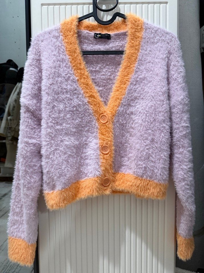Örgü, mor ve turuncu renklerde, V yaka, uzun kollu, normal midi boyda, bol kesim, desen içermeyen rahat hırka. L beden ama ben s bedenim banada oluyor