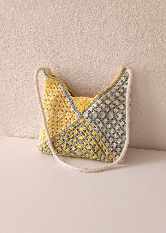 Sarı, yeşil ve krem tonlarda alize diva ile örüldü. Pamuk poplin astarlı ve çıtçıtlı, sapı pamuk. Ölçüler fotoğraflarda. Dolabımda başka örgü çanta modelleri de mevcut.