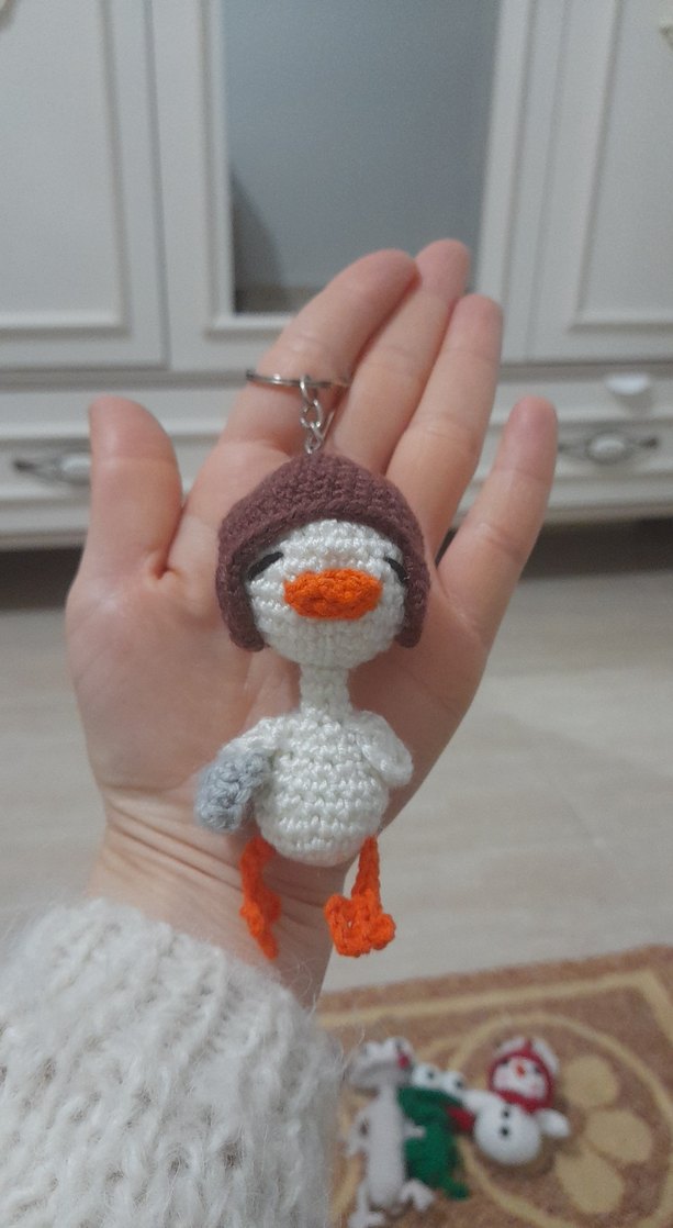 Örgü ördek figürlü, bej ve gri renklerde rahat ve retro tarzda kadın anahtarlık. Küçük ve taşıması kolay.