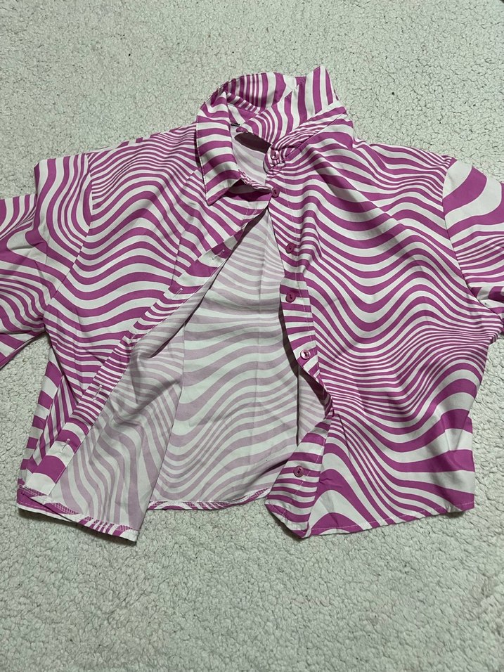 örgü pamuklu kısa kollu tişört, bol kesim ve yuvarlak yaka ile. Koyu pembe ve krem renklerde baskılı tasarım sunar.