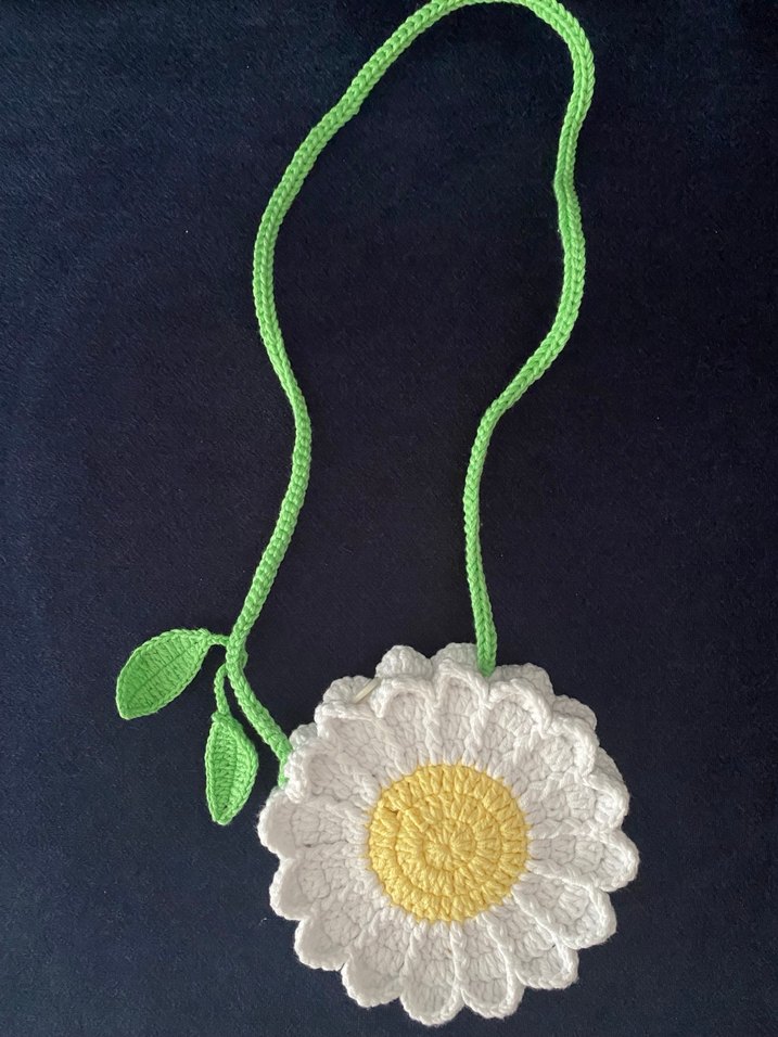 Örgü, bohem tarzda kız çantası, renkli papatya deseni ve yeşil yaprak detaylarıyla. %100 pamuk ip ile örülmüştür. İstenilen renklerde örülebilir.