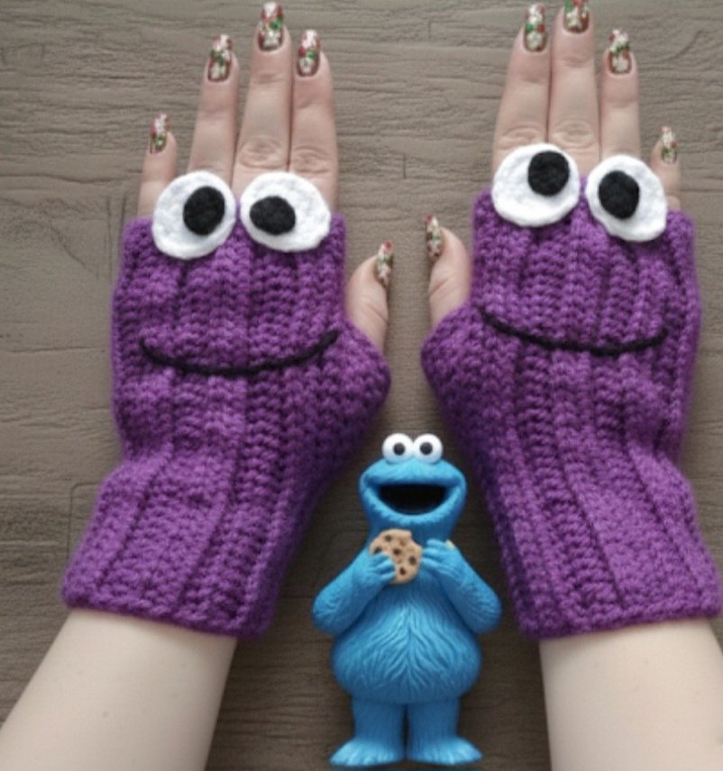 GÖRSEL BANA AİTTİR İLAN AÇIYORUM KURABİYE CANAVARI FİGÜRÜ beyaz göz detaylı örgü parmaksız eldivenler. Pop kültür esintili, renkli ve rahat bir tasarım.