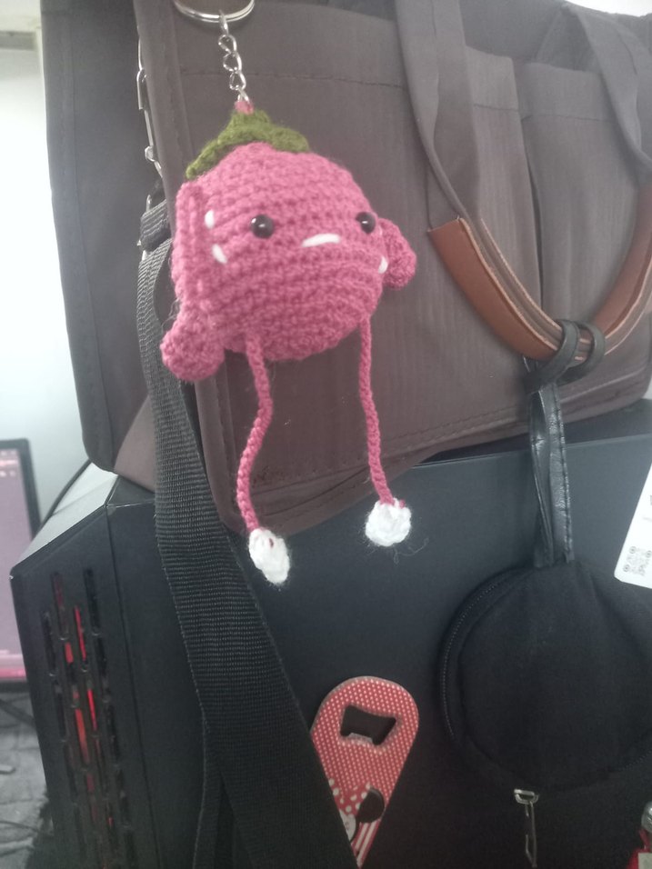 Renkli pembe örgü anahtarlık, rahat ve punk esintili tasarımıyla dikkat çekiyor. Anahtarlarınıza farklı bir hava katmak için ideal.