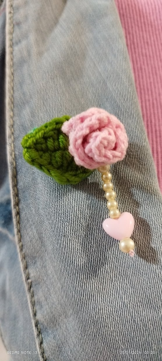Koton iple örgü pembe çiçek ve yeşil yapraklı, inci detaylı, günlük kullanıma uygun broş.