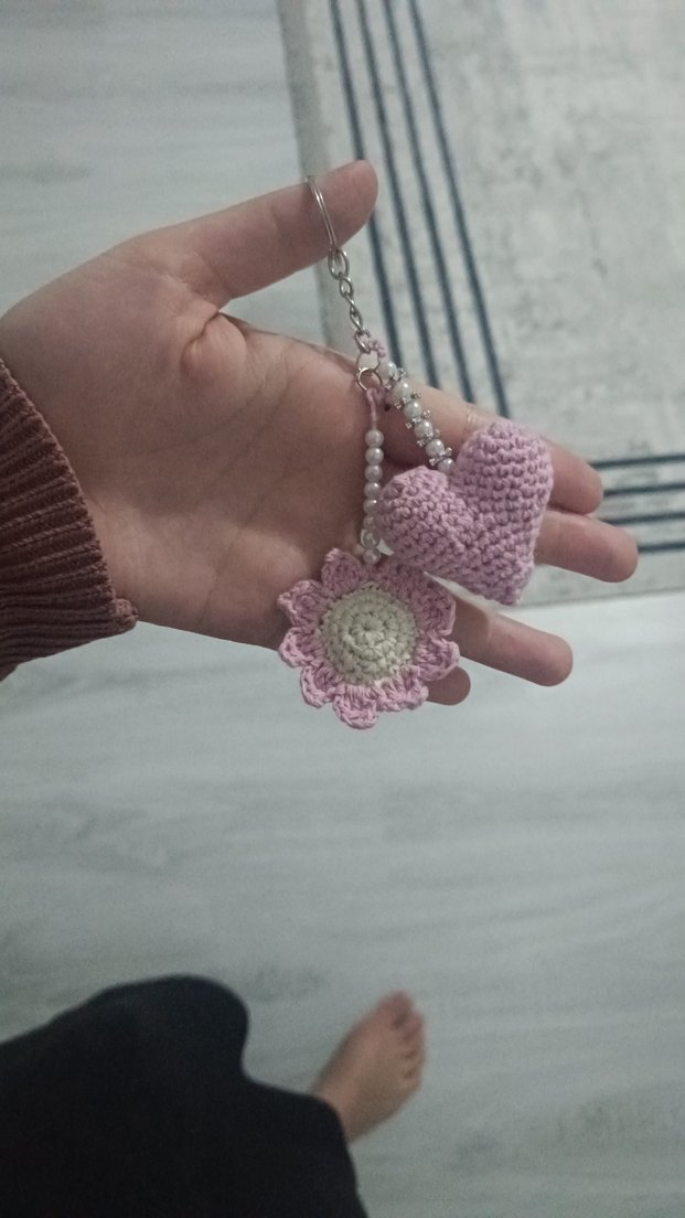Örgü pembe çiçek ve kalp figürlü, pastel tonlarda, rahat bohem tarzı anahtarlık. ikili fiyattır birleşiktir