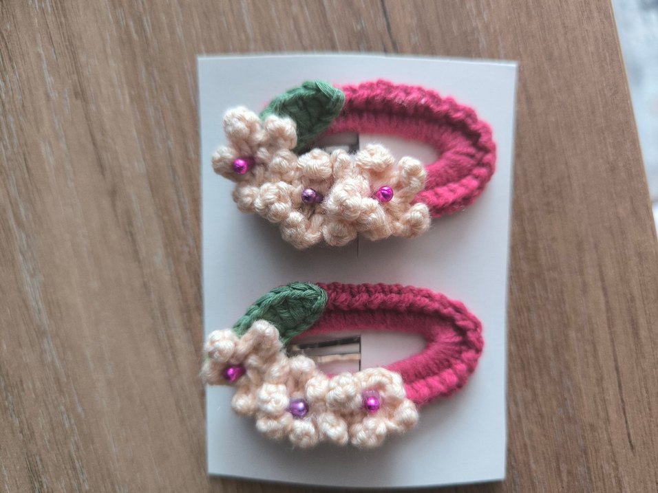 çiçek desenleri ve renkli boncuk detaylarıyla örgü pembe çocuk tokası seti toplu alımda indirim yapılır
