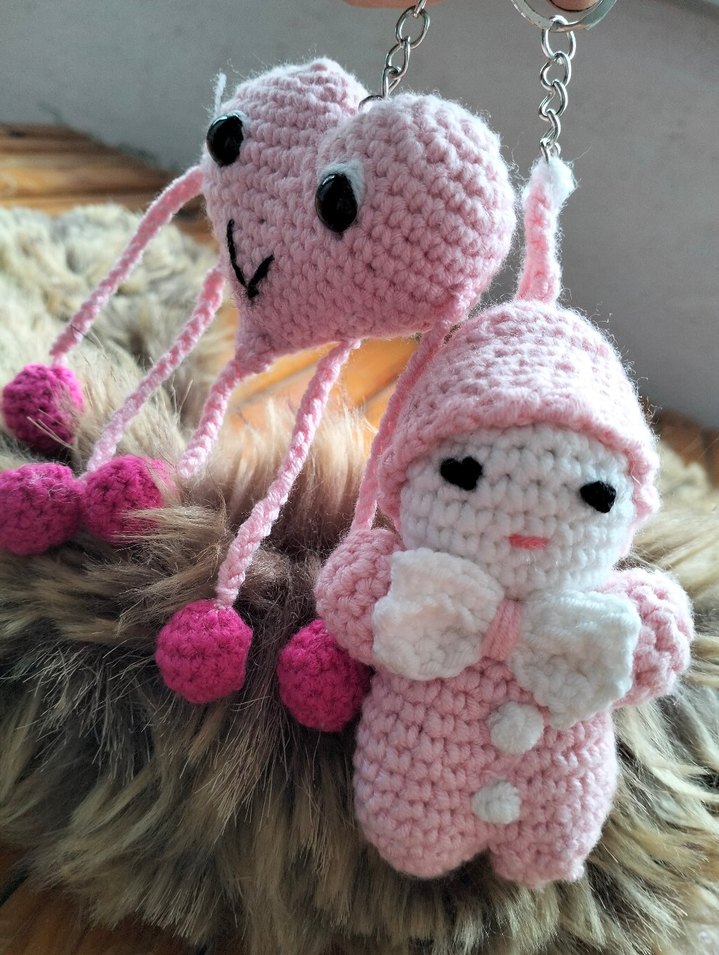 Pembe renkli, örgü kalp ve bebek figürlü iki anahtarlıktan oluşan set. Sıcak ve renkli detaylarla bohem tarzına uygun.
