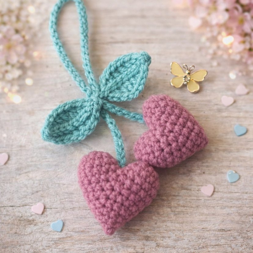İki pastel pembe örgü kalpten ve yeşil yapraklardan oluşan bohem tarzda örgü anahtarlık. Rahat ve retro bir görünüm sağlar.