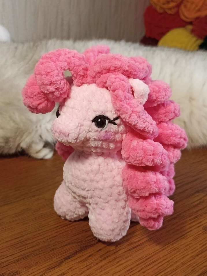 Kıvırcık yeleli, nakışlı gözlü yumuşak pastel pembe peluş oyuncak at.