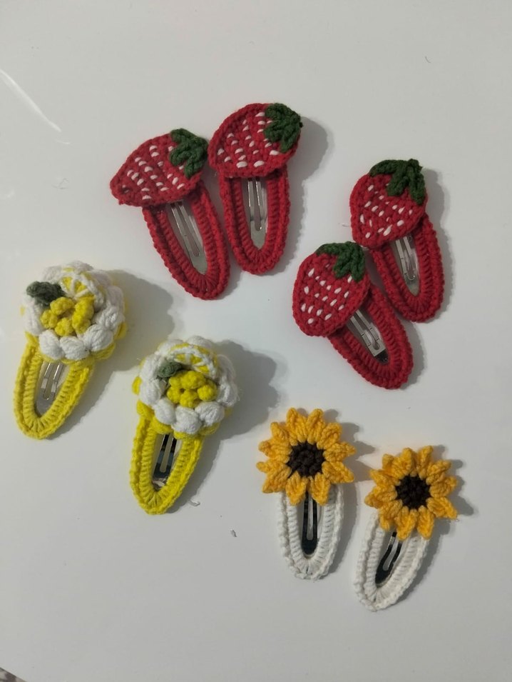 Nakışlı çilek, papatya ve ayçiçeği desenli renkli örgü çocuk saç tokası seti, bohem tarzı için uygun.
