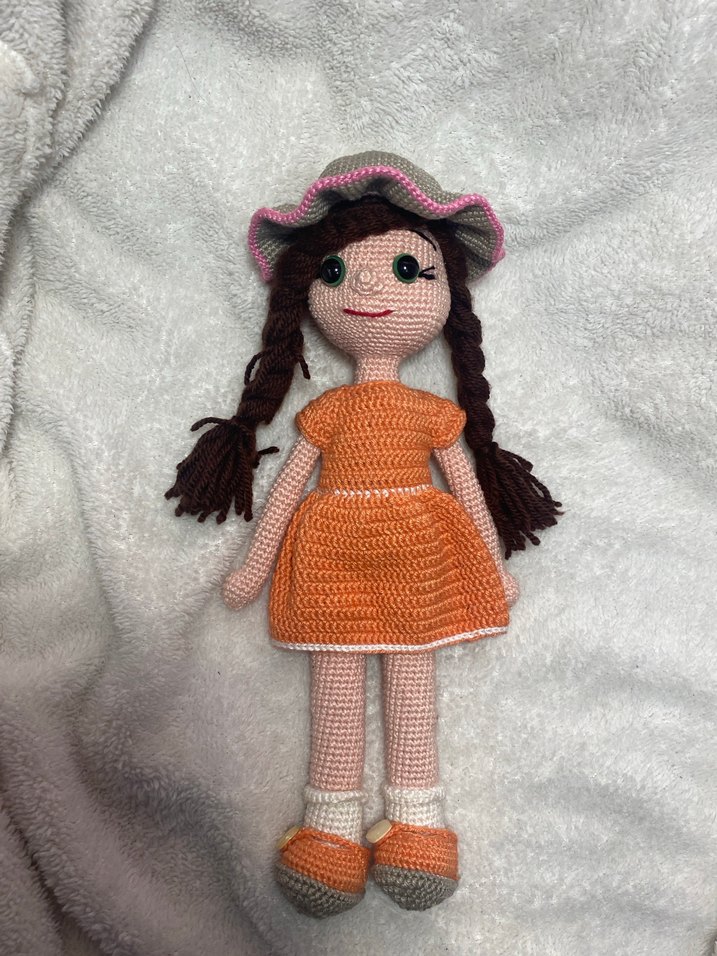 Kahverengi örgü saçlı, turuncu elbiseli, şapkalı ve ayakkabılı renkli örgü bebek. Boyu 32-34 cm