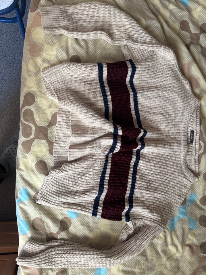 uzun kollu, salaş kesim örgü kazak. Kahverengi ve mavi tonlarda yatay çizgiler içerir, günlük rahat kullanıma uygundur. Çok güzel bir kazak. Bol kesim ben s giyen biri olarak giyiyordum